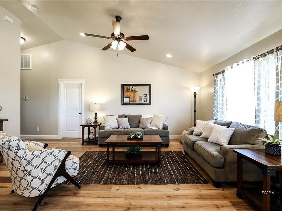 - Flooring- Carpet, Flooring- Tile, Vaulted Ceilings, Flooring- Hardwood, Ceiling Fan(s), Smoke Detectors, Chandelier(s), Insulated Garage
