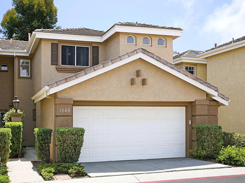 Nestled in the desirable Chateau Village community is this bright end unit that features high ceilings, an open floor plan w-cozy fireplace, shutters, and slider doors that open to a private patio yard. Recently updated eat-in kitchen features stainless appliances and direct access to the 2 car garage. Spacious dual master suites upstairs with beautifully updated bathrooms with travertine, large walk-in shower, and soaking tub. Complex features pool/spa/tennis/exercise room. Walk to shopping and theatres.