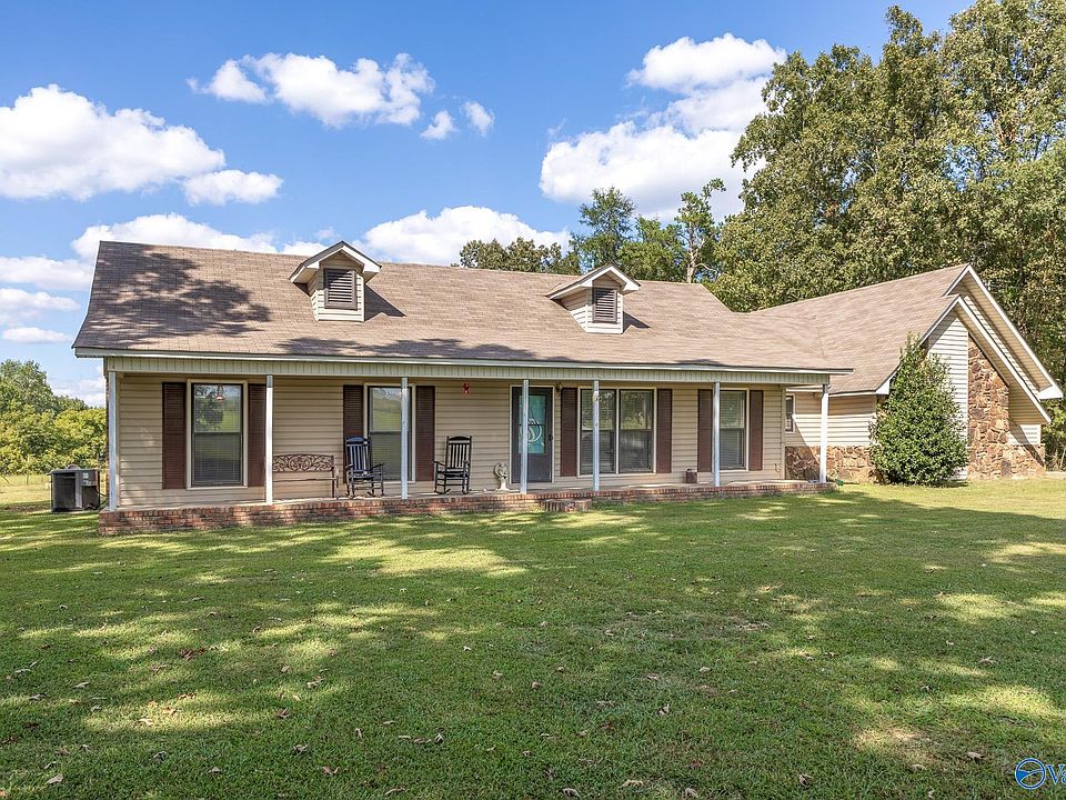 Charming 3-bedroom, 2-bath home on 2 lush acres! The cozy living room features a wood-burning fireplace & gorgeous wood beam ceilings add character and warmth. The well-appointed kitchen features granite countertops, custom cabinets, and a pantry! The spacious master bedroom boasts a walk-in closet & an attached master bath. Enjoy outdoor living with an above-ground pool & deck, perfect for summer fun. Relax on the concrete patio or the welcoming front porch. A gravel driveway leads to the property, offering ample parking space. Need storage? A 3-bay metal shed is ready to accommodate your tools & equipment. Safety is a priority with an in-ground storm shelter & 2 car attached garage.
