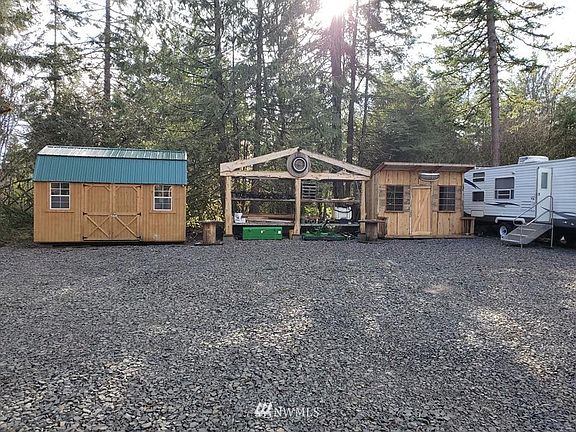 An oasis in the trees, minutes from I-5. 5 acres nestled in tall timber, with a great spot cleared for circular driveway and potential building spots. 12gal/min well with 32gal pressure tank is in and wired for a generator or bring PUD from the driveway. Permitted electrical 380 meter base with 200amp passthrew panel with generator interlock, along with 2nd 200amp disconnect located in rustic well house. Water, 30amp RV plug and additional 20amp outlet run to top of property where a 10x16 lofted barn, storage racks, indoor off-grid shower house and 20ft conex box with lean-to covered area sit. 2012 Wildwood 27ft single slide bunkhouse that has been well maintained will stay (title in hand). Build your dream home or just move in and chill...