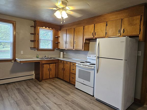 Lovely first floor apartment with sunset views, pretty hardwood floors. New kitchen floor in the eat in kitchen with stove and refrigerator. 2 bedrooms. Ceiling fans in some rooms. Lots of closet space (entry closet, 1 closet in each bedroom, hall closet, linen closet and kitchen pantry closet.) Bathroom has ceramic tile and a nice linen closet. Laundry hookups are in the building. Rent includes heat, water/ sewer/ trash. Tenant pays electric. Sorry no pets, smoking or vaping. Off street parking 1 year lease. Tenant pays electric. Water/ sewer/ trash and heat are included. Sorry no pets/animals and no smoking/vaping.