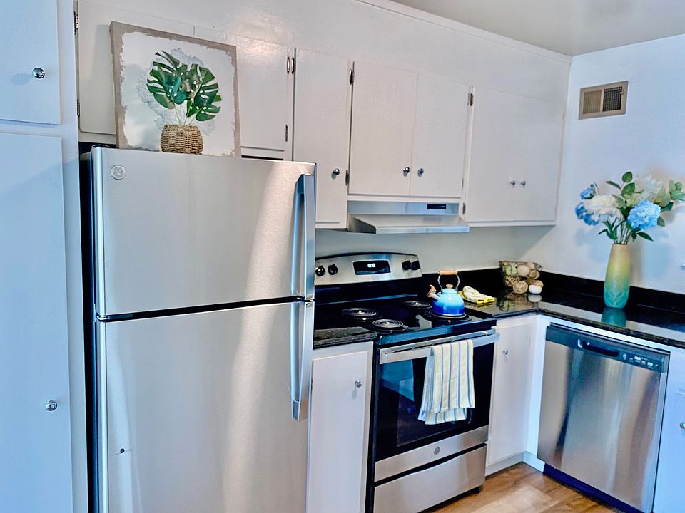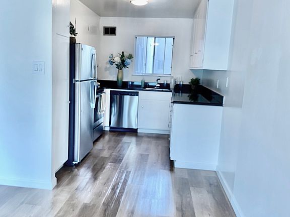 Huge 2-Bedroom, 2 bath apartment in desirable and tree-lined Adams Point residential neighborhood with its own private deck. The apartment features a living room off of the entryway and a large dining area with its own window. Beautifully updated with luxury vinyl plank flooring, stainless appliances (including stove, refrigerator and dishwasher) and granite countertops. Tons of closets including large closets in each bedroom, including a walk-in bedroom closet, an entryway closet and a large closet/pantry in the dining room. Great building with an elevator and a laundry room on the ground floor with app or coin-pay. It is an easy neighborhood walk or drive to vibrant areas with shops and restaurants such as Lake Merrit and Grand Ave. One garage parking space is included with the rent. Owner pays water/sewer and trash.
