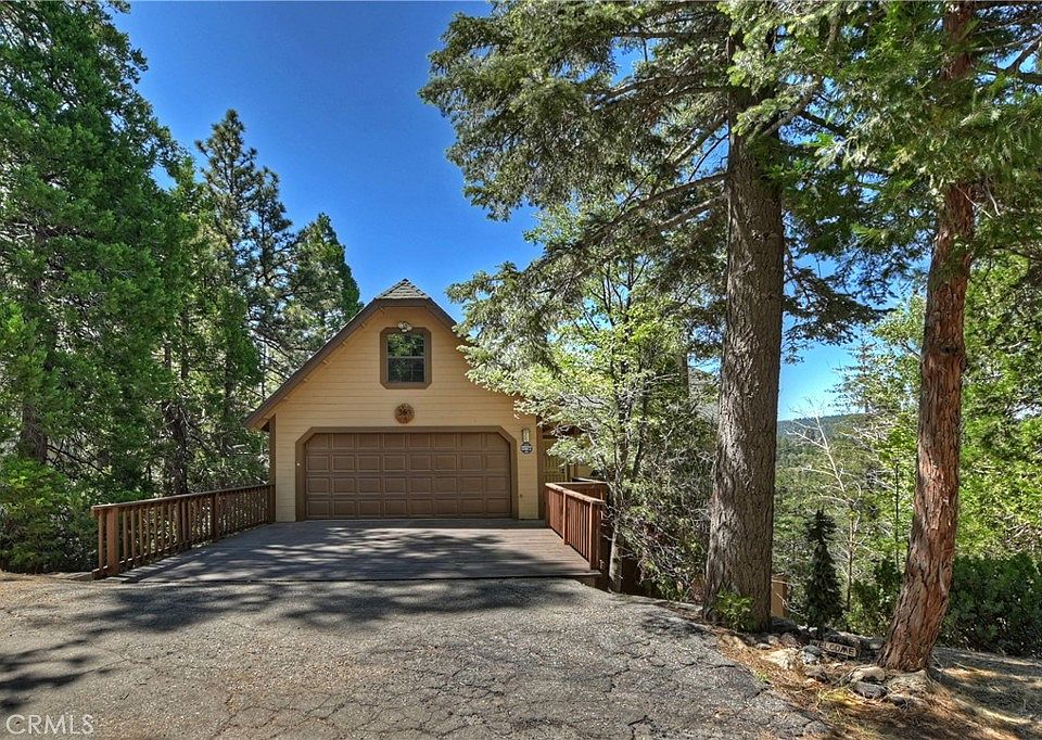Available for backup offers! The coziest mountain getaway with all the modern amenities! Located on a private drive in a beautiful neighborhood, with serene & peaceful views. Easy year round living, just off the main road with level entry into your 2 car garage & straight into the house! The main level has an open and airy feel with vaulted ceilings & functional flow. Nice size living area with a charming rock fireplace, just adjacent is the kitchen with newer stainless appliances and then a good size dining area. There is also a half bath on the main level! Spacious rear deck to enjoy the gorgeous tree & far views! Downstairs are 3 bedrooms & a full bathroom. The primary has it's own bath & deck! Inside the garage you will find the laundry area and also a pull down stairway up to a nicely finished bonus area! Great space for an office or hobby room! Outside there is even a large shed for all of your extra gear! This house has been meticulously maintained & is ready to enjoy! A great little package in a very convenient location, just a few minutes to Blue Jay & Lake Arrowhead. House will be sold furnished & has AC too. A must see for the ultimate getaway!