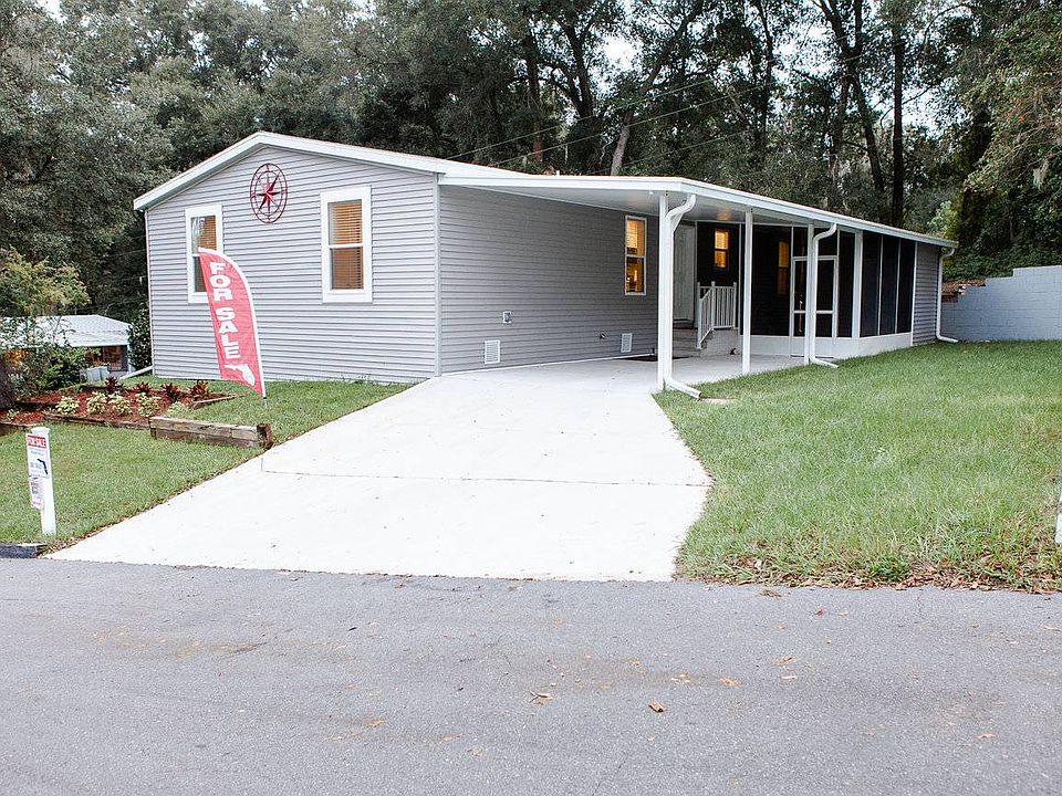 A MUST SEE There is no other lot this secluded !This brand new Palm Harbor home is located in the tranquil 55 and over community of Hidden Hills. This 3 bedroom 2 bath home is every new home owners dream. The galley kitchen features grey shaker cabinets,champagne beveled back splash,Marmo Bianco counter tops and all new appliances. Open concept living room and dining area is perfect for entertaining and the engineered wood plank flooring is perfect for easy clean up. Soft palette grey walls, will match perfect with any decor,master bedroom with 2 large walk in closets,master bathroom has a vanity perfect for getting dolled up, before hitting the downtown area of Deland that is a short distance away. Enjoy the outdoors while sitting in the screened in lanai, or fire up the BBQ on your concrete back yard patio while enjoying the wooded scenery. Large carport with an attached shed is perfect spot to store all you holiday decor and more. Washer and dryer hook ups are in the home. Enjoy the Hidden Hills community pool along with the clubhouse which boast many activities. Schedule a tour of this home today!