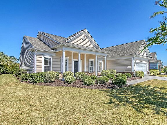 Beautiful and extremely well maintained Bluffton Cottage model surrounded by green space and lush landscaping on a private homesite.Featuring 3 bedrooms, 2 baths, sunroom, and large screened lanai with vinyl windows. A welcoming full front porch with stately columns and stone detail sets the scene. As you walk inside, you're greeted by hardwood floors extending from the foyer into the great room, dining room, kitchen, eat-in breakfast nook, sunroom, and hallways.The kitchen overlooks the great room and offers many upgrades, including granite countertops, tile backsplash, staggered cabinetry with crown molding, lower cabinet pull out shelving, recessed can lighting, stainless steel built-in wall oven and microwave, 5 burner gas cooktop, and the refrigerator conveys. At the back of thehome is a light-filled sunroom with hardwood floors. Stepping out from the sunroom you'll find an extra large screened-in lanai with vinyl windows making this the perfect room to enjoy with friends all year long. The backyard setting is tranquil, the way this homesite is situation offers the owners plenty of privacy while also enjoying the beautiful landscaping surrounding the home. Back inside you'll find the primary suite which includes granite countertops, tiled flooring, double sink vanity, walk-in shower, and large walk-in closet. The second and third bedrooms are located on the opposite side of the home giving guests maximum privacy. The second bedroom is 11' x 18'; large enough to be used as a dual purpose room combining a bedroom and office/den or a second primary bedroom. The guest bathroom with granite countertops is located between the second and third bedroom. The laundry room with included washer and dryer leads you into a two car garage. Don't miss this incredible home located in Charleston area's premier Active Adult community, Del Webb at Cane Bay Plantation, please book your showing today!
