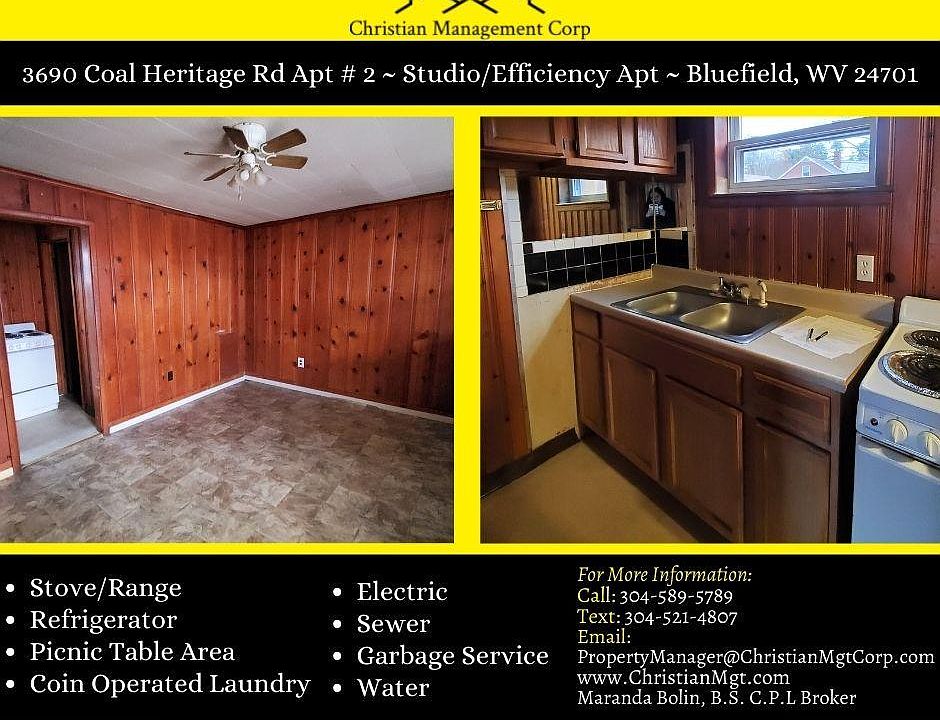 3690 Coal Heritage Rd Apt # 2 ~ Studio/Efficiency Apt ~ Bluefield, WV 24701 RENTAL ONLY: Security Deposit: $600. Can be made in payments if needed. Monthly rent: $600/month includes water, sewer, electric, and trash service. Studio apartment furnished with stove and fridge is available for rent immediately, located in Bluewell, WV at The Heritage Apartments directly across the street from Lynn\'s Drive In. This location features electric heat, on-site coin operated laundry room, and is within walking distance to bus stop, pharmacies, restaurants, shopping, banks, and more. Christian Management Corporation Office Hours: Mon-Fri 9:00AM-5:00PM & 10:00AM-2:00PM the 1st Saturday of every month You can view THIS property 7 days a week! Most pets welcome with a $200.00 pet fee per pet and signed pet agreement. Maximum 2 pets. No aggressive breeds due to insurance restrictions. Clean, safe, quiet, crime & drug-free are our priorities for our residents! We support Equal-Housing Opportunities! Good people with good, bad, low, or no credit but stable employment or Social Security are welcome. Criminal Checks: -NO recent felonies in the last 7 years -NO evictions in the last 7 years -NO sex offenders Is this property not what you are looking for? ChristianMgt.com.com.