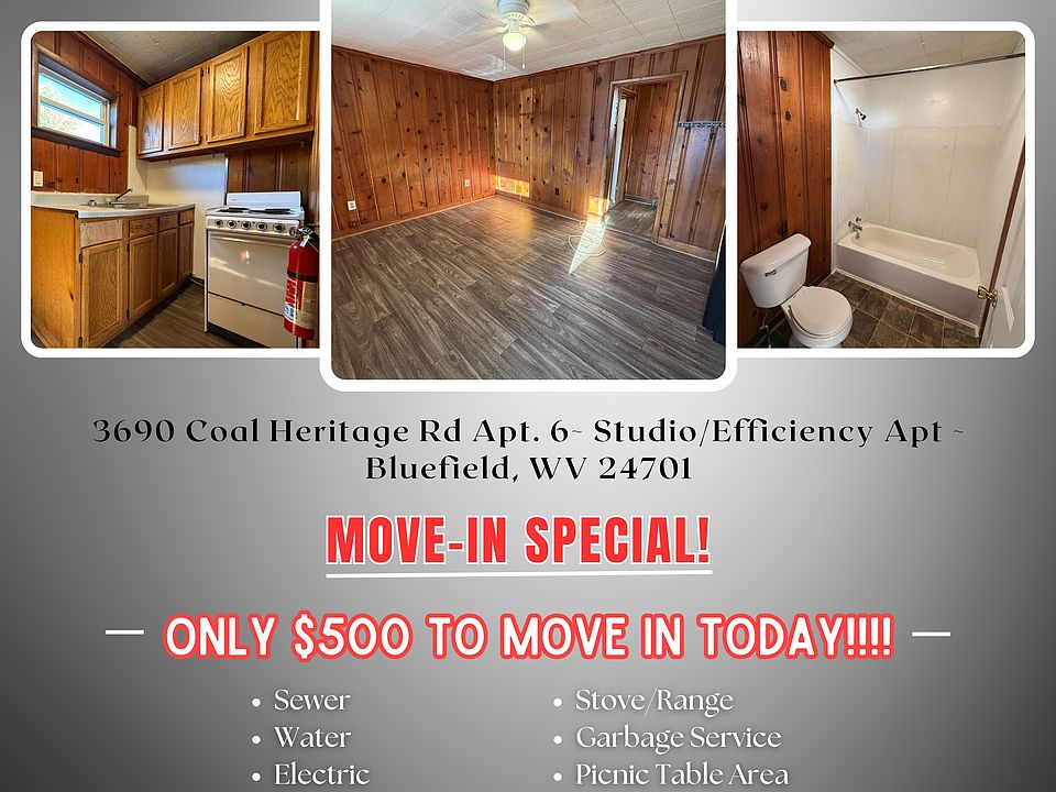 3690 Coal Heritage Rd Apt #6 ~ Studio/Efficiency Apt ~ Bluefield, WV 24701 ONLY $500 TO MOVE IN TODAY RENTAL ONLY: Security Deposit: $695. Can be made in payments if needed. Monthly payment: $695/month includes water, sewer, electric, and trash service. Studio apartment furnished with stove and fridge is available for rent immediately, located in Bluewell, WV at The Heritage Apartments directly across the street from Lynn\'s Drive In. This location features electric heat, on-site coin operated laundry room, and is within walking distance to bus stop, pharmacies, restaurants, shopping, banks, and more. Christian Management Corporation Office Hours: Mon-Fri 9:00AM-5:00PM & 10:00AM-2:00PM the 1st Saturday of every month You can view THIS property 7 days a week! Most pets welcome with a $300.00 pet fee per pet and signed pet agreement. Maximum 2 pets. No aggressive breeds due to insurance restrictions. Clean, safe, quiet, crime & drug-free are our priorities for our residents! We support Equal-Housing Opportunities! Good people with good, bad, low, or no credit but stable employment or Social Security are welcome. -MUST pass background check -NO evictions in the last 7 years -NO sex offenders Is this property not what you are looking for? View our other available #homes, #mobilehomes, #apartments, and more on our Facebook or our website!