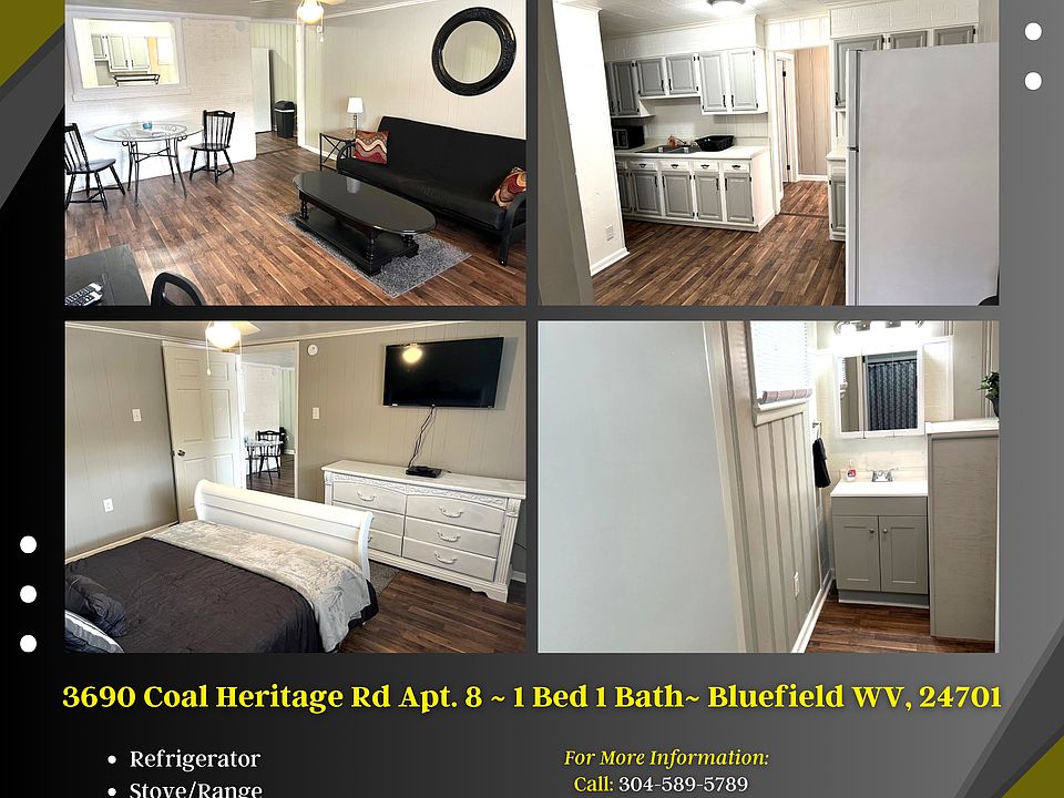 3690 Coal Heritage Rd Apt. 8 ~ LARGE 1 Bed 1 Bath Apartment ~ Bluefield, WV 24701 Security Deposit: $1,100. Can be made in payments if needed. Monthly payment: $1,100/month. ALL utilities, wi-fi, AND power are included. Sleep peacefully in the queen-size bed in the oversized bedroom. There is a washer and dryer making it convenient to wash clothes at anytime. You will be able to relax with a TV and DVD-player located in the living room and bedroom to watch Redbox movies. Redbox is a 3-minute drive away, near the local Dollar General. You will also be within walking distance to restaurants, including Lynn's Drive-In and Gino's Pizza, and areas to shop. Extra security, all on one level apartment, with a digital door code and once inside you have an extra security door lock. Mailboxes are on the property along with a community picnic table and grill. Central heating and air are included along with ceiling fans in the living room and bedroom. Our units were just remodeled with brand new paint, bedding, and flooring throughout. If rented furnished, everything you need from closet hangers to hang your clothes, inside of a full-size closet, and with a dresser for additional space. Christian Management Corporation Office Hours: Monday, Wednesday and Friday from 9:00AM-5:00PM & the first Saturday of every month from 10:00AM-2:00PM We will be closed to the public every Tuesday and Thursday. You can view THIS property 7 days a week! Most pets welcome with a $300.00 pet fee per pet and signed pet agreement. Maximum 2 pets. No aggressive breeds due to insurance restrictions. Clean, safe, quiet, crime & drug-free are our priorities for our residents! We support Equal-Housing Opportunities! Good people with good, bad, low, or no credit but stable employment or Social Security are welcome. -MUST pass background check -NO evictions in the last 7 years -NO sex offenders Is this property not what you are looking for? View our other available #homes, #mobilehomes, #apartments, and more on our Facebook or our website!