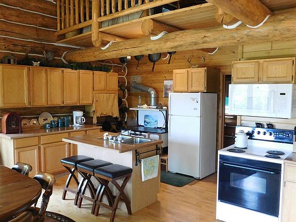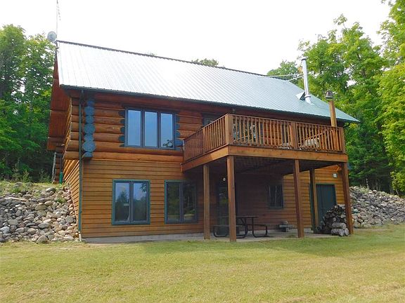 Little Bear Lodge Custom built, chalet style, 3 bed, 2 full bath, full log home or camp / cottage on 107 +/- acres. The main floor offers a master bedroom, full bath and an open concept kitchen, dining area and living room, with a beautiful spiral staircase leading to a 40 x 15 loft area for plenty of extra sleeping space, office space or sitting area, the choice is yours. From the living room there is access to a rear elevated deck with fantastic views of a 1/2-acre pond, lush forest and wildlife galore. Downstairs you'll find a partially finished basement with a walkout lower level where you can easily gather wood for your woodstove without dragging it through the finished portion which offers 2 bedrooms, a 3/4 bath and family room to gather and enjoy friends and family alike. Outside you'll find a 16 x 30 barn / tack shack and a horse corral along with nice trails that meander throughout the property. Property is in Forest Management program. This is a must see, call today for a private showing.
