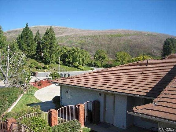 This home is one of the most popular models in the Country Homes. 2 bedrooms down and master suite upstairs. Tiled entry, dining room and kitchen. Kitchen has been remodeled with granite counters, tile floor and door to living room has been widened to open up the kitchen. Both bathrooms have granite counter tops. New windows and tile roof has been power washed and treated to hold the color. The master suite upstairs has it's own balcony with a view of the hills. It has a large dressing area and a window in the toilet area to let more light in. Gated front yard, 2 car garage and direct access to the home from the garage. Backyard provides a view of the hills and Anaheim Hills. Whole new furnace and air conditioning unit including new ducts and compressor.