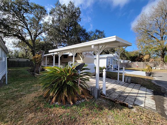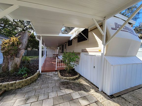 This well-maintained 12 x 40 1990 Hitchhiker, anchored and skirted, is set in the most scenic location of the park. Beautifully landscaped with loads of charm, this move-in-ready property will make you feel right at home. The exterior of this delightful trailer comes with all the extras including concrete driveway, roof over trailer, carport and lanai with metal roof, solid wood flooring with rails in large lanai, 8 x 10 woodshed, and new breaker panel. The decorative concrete pavers that wrap around the property and lush flora in a garden-like atmosphere are sure to dazzle the senses. The picturesque setting in a semi-private location with no units behind and close to a large retention pond feels like you're living in a little slice of Florida paradise. Step inside to a tastefully decorated unit with many upgrades that will ensure comfort and convenience year-round. Solid oak cabinets along with wood laminate and parquet floors throughout the home present a warm and inviting environment. Fully furnished with a roomy open floor plan and quality window treatments are all color-coordinated in soothing turquoise and sandy brown hues. Furnishings include luxurious leather queen size sleeper couch, 2 chairs, TV, stylish china cabinet, adorable kitchen nook with table and chairs, and comfy queen size bed. The kitchen is equipped with a propane stove and oven, microwave, newer refrigerator, toaster oven, large pantry, mobile kitchen cart topped with wood cutting board along with numerous drawers and cabinets containing cooking and dining ware items. The bedroom has him and hers closets along with built-in dresser drawers. The modernized roomy bathroom has a tub/shower combo, sink, and toilet. The AC unit in the kitchen quickly cools the whole unit and the interior stays comfortable most days with trees to shade and frequent breezes. Also included is a humidifier and portable space heater. Top off the amenities with a washer and dryer, you'll want for nothing in your new home! Happy Days RV Park in Zephyrhills offers year-round annual rates from $300.00 per month which includes water, sewer, trash, and use of park facilities including heated pool, shuffleboard, billiards, poker, horseshoe pits, and more! The quiet, clean, and convenient RV park is just 20 minutes from Tampa, Florida. But the most attractive feature about this friendly park is the people who reside in the neighborly community, where friends quickly become family. There is a reason it's called Happy Days because they are! Immediately available and priced to sell at $19,900 with one of the lowest lot rents in the city, you won't want to miss out on this opportunity to start living the good life! All listing information is deemed reliable but not guaranteed and should be independently verified through personal inspection by appropriate professionals. Integrity Mobile Home Sales cannot guarantee or warrant the accuracy of this information, measurements, or condition of any property. Measurements are approximate. Lot rent is subject to change.