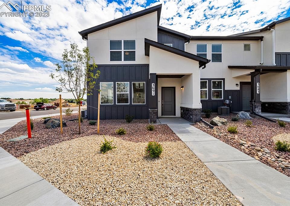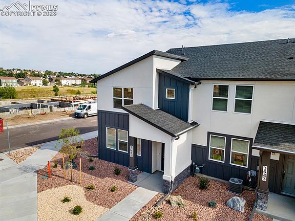 Better than new, never-been-lived in MOVE-IN READY End unit has Blinds installed, new WASHER, DRYER and REFRIGERATOR included. Main Level has open floorplan and gleaming Wood Laminate flooring. Quartz Countertops in Kitchen and Baths. Stainless Steel Appliances in Kitchen, Undermount Sink, Gas Range, large Kitchen Island. Walk-in Pantry! Master suite has Walk-in Closet. Master Bath has counter-height Cabinets, dual Vanity, upgraded Tile Flooring and oversized Shower with built-in Seat. Upstairs Laundry Closet with tile floors, NEW WASHER AND DRYER. Air-Conditioning, Nest Thermostat and Garage Door Opener included. Large corner lot has only one attached wall and sits just around the corner from Greenways lake, park, open space and trails. Community sits back from the Powers Corridor-- convenient to Theaters, Restaurants, and Shopping. Easy commute to Fort Carson and Peterson Air Force Base. Slip on your VR Goggles and take our Matterport tour of this Fabulous Townhome today!
