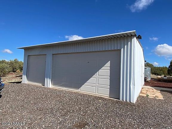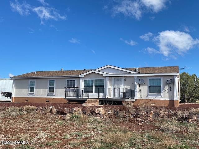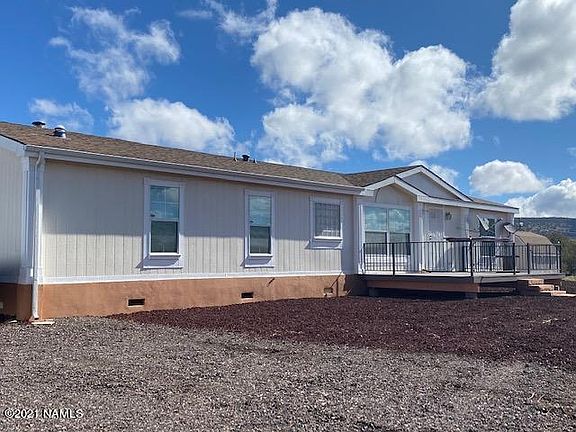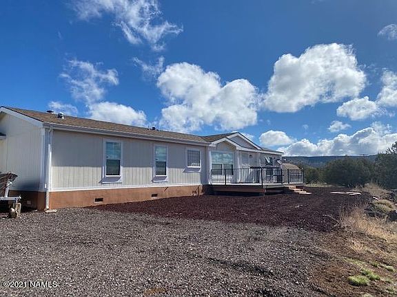 Great full time home or place to get out of the desert heat! 4.70 acre lot in Kaibab West here in Ash Fork that is completely fenced, very private with spectacular views. This single level manufactured home is large with 4 bedrooms and 2 full baths, two living areas (one with a wood burning freestanding stove), large eat in kitchen with formal dining room, front deck to take in the views as well as a covered back patio where you can sit and watch as the wildlife visits this great property. There is also a large 3 car detached garage with a separate space for a workshop or another room with a half bath. Two separate sheds and manicured landscaping on the entire property.