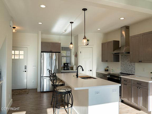 Furnished and situated in a new subdivision, this property seamlessly blends modern living with the natural beauty of Homer.Thoughtfully designed, this 1,840 square foot contemporary home features three bedrooms and two bathrooms. The functional layout includes two primary suites--one on each floor--ensuring privacy for all guests.If you love to entertain, the kitchen and dining area are perfect for you. The versatile layout accommodates a large table or a cozy sitting area, making it ideal for connecting with guests. With an additional living space upstairs and two outdoor areas, this home is designed for gatherings of any size. You'll have plenty of room to host everything from intimate get-togethers to larger celebrations, allowing you to enjoy time with family and friends. All furnishings & appliances included! Enjoy stunning views of the bay, mountains, and Homer Spit, all from this conveniently located home near the hospital, schools, and shopping. A complete list of builder details and upgrades available!