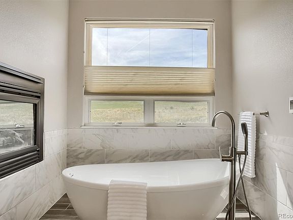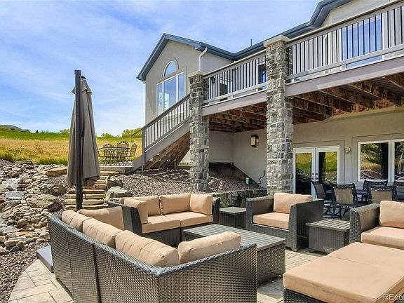 A glorious Colorado playground 5 acres of rolling hills, front range views, and easy access to horse and hiking trails. This timeless walk-out ranch boasts clean lines, upgraded architectural features such as arched walkways, beautiful hardwood and stone inlaid floors throughout, stacked stone wall features including a custom plant ledge, oversized windows that bring your outdoor oasis inside year-round, custom built-ins and so much more. The main floor offers a large foyer with visibility to the key entertaining areas, an open and bright dining room, powder bath for guests, private office with custom hardwood wainscoting and coffered ceilings, family room with custom built-in bookcase and access to an incredible entertainment deck, an expansive eat-in kitchen equipped with stainless steel appliances, abundant storage, a hearth or breakfast nook area & unused space that would be perfect for a future coffee bar. The pi ce de resistance of the main floor is the master suite with incredible views & access to the entertainment deck, a spa inspired en-suite, a grand master closet with direct access to the laundry room that sits in between the kitchen and the garage. The walkout lower level offers a large entertainment area including a screening & gaming area, spacious wrap bar, a small fitness nook, two bedrooms with ample space and natural light and an updated shared bath with custom stone, access to a peacefully secluded partially covered patio with built-in fireplace, and water feature too. This property is zoned for equestrian use up to 2 horses and sits towards the front of Bell Mountain Ranch which is a crown jewel of Douglas County. Through the community's conservation efforts it offers residents a sense of seclusion without the distance to major amenities, it also offers a number of group activities for adults and kids alike.