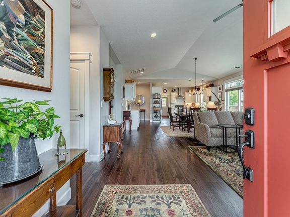One of a kind, custom bungalow home in Chegwyn Farms! One level home with loads of designer extras:all cabinetry in home has fully extending drawers, soft close cabinets, LVP throughout, built-in vacuum, solid doors, millwork around doors & windows & blinds throughout. A welcoming extra deep front porch w/cedar ceiling on a corner lot. Open concept living greets you as you open the door with a vaulted living room, anchored by large picture windows w/top-down/bottom-up blinds, a gas fireplace w/raised hearth & custom wood surround. The vaulted dining has a sliding door w/transom and blinds for access to the side yard/patio & custom built-in wet bar with wine refrigerator, sink, quartz counters and backsplash. The kitchen is a dream with hidden functionality, such as an under counter roll out island, pull out drawers, sweep access for built-in vacuum, glass front cabinetry, extra lighting for task work, eating peninsula, quartz counters & full backsplash. It is a chef's dream w/built-in Whirlpool French door refrigerator with water & ice, built-in oven and gas range with two ovens, Fisher & Paykel two drawer dishwasher, double stainless steel sink w/hot water tap. The sellers adjusted the floor plan & that made the two front bedrooms & bath bigger. The front bedroom has a large front window, ceiling fan, custom closet along with a pocket door that leads to a Jack&Jill bathroom w/access to the bedroom or from the hall for guests. The bathroom has heated tile floors, quartz counters & pocket door to the toilet & tub/shower combination. The second bedroom/office has French doors with frosted glass, custom closet & large window. The primary suite is vaulted w/fan, large custom walk in closet, reed glass door to access side yard. The bath has a pocket door, heated tile floors, walk in full tile shower & quartz counters. Half bath & laundry with storage & apron sink! Covered back patio w/cedar ceiling, nice size fenced yard, oversized garage with custom cabinets & 18' door!