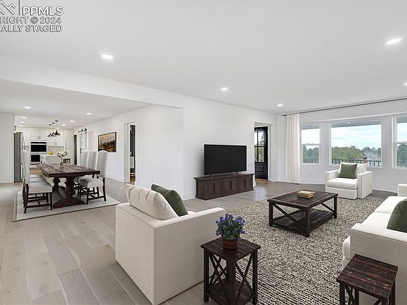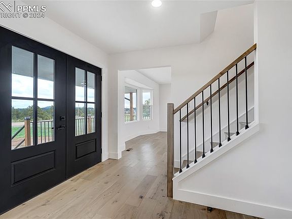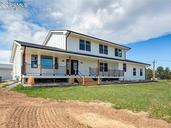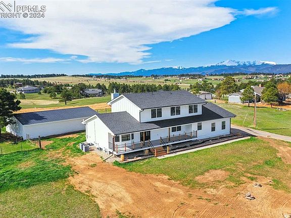 Fully remodeled like new home w/barn sitting on 5+ acre horse property w/incredible views of Pikes Peak & the Front Range. Immaculate craftsmanship & details shine throughout this home. A covered porch greets you, leading into the foyer w/ engineered wood floors that flow throughout the main level. The gourmet kitchen is a cooks dream, featuring a stunning quartz island, pendant lighting, sink w/views, high end appliances including gas range, wall mounted ovens, SST fridge, pot filler, textured subway tile backsplash, gorgeous ceiling high cabinets w/soft close/black metal hardware & walk-in pantry. The adjoining dining area is surrounded by stunning views of the landscape. From here, walk-out to the trex deck & backyard. The great room impresses w/ bay window & wall of windows, can lighting & wood floors. The formal dining room has a modern chandelier & easy access to the kitchen. Powder ½ bath has designer wallpaper & vanity. Upper lvl primary suite w/sitting area, mountain views, new carpet, walk-in closet & luxury 5pc bath. The bath has a standalone soaking tub, spa shower w/dual rain heads, pebble tile floor, designer mirrors, heated tile floor & double vanity. New carpet throughout the upper lvl. The 3 additional upper bedrooms all have incredible views & easy access to hallway full bath w/ granite double vanity & designer tile shower surround. Basement offers open family room w/wet bar featuring quartz counters, beverage fridge, plenty of cabinet storage, & LVP floor. 2 spacious basement bedrooms have easy access to new 3/4 bath. Bathroom has new vanity w/ herringbone design, quartz counters & floor to ceiling shower tile. Bonus items include; Large pole barn for horses/animals/cars/toys, parking for RV’s, oversized attached garage, all new central A/C, 2 HE furnaces, modern light fixtures, designer paint, energy efficient windows, mud room w/laundry tile flr, dog washing sink, extra storage. Easy access to D-38 schools, shopping, USAFA & main roads.