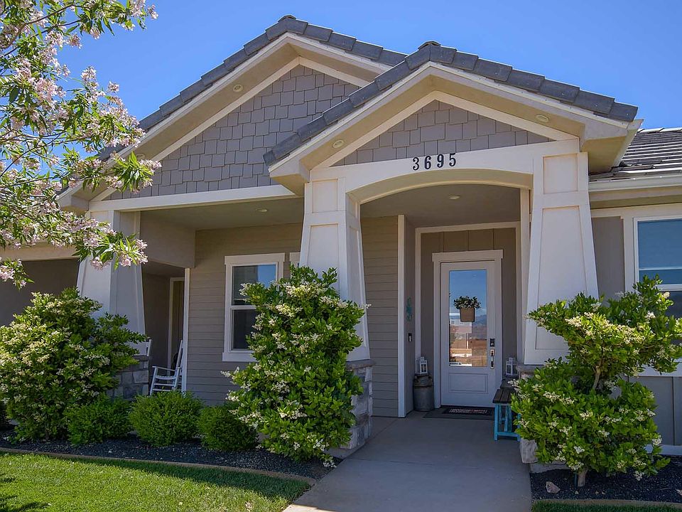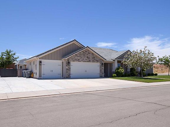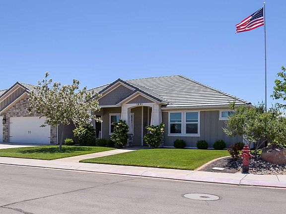Fabulous single-level Dixie Springs home has open floor plan, custom cabinets, quartz counter tops & beautiful tile work throughout. Oversized 25' deep, 3-car fully insulated garage w/ HVAC, epoxy floors & built-in cabinets, water softener, tankless water heater, propane tank for fireplace. Storage shed & hot tub are also included! Great views of Pine Valley Mtn & ''Everlights'' on front exterior
