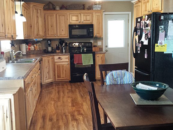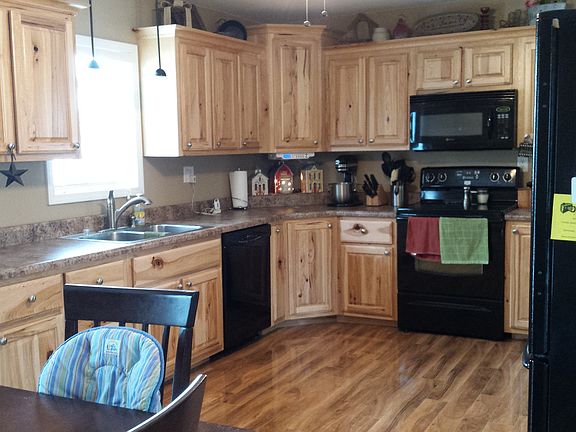 This 1500 sq ft house has 3 bedrooms and 1 bath. Has been completely remodeled in 2009, including electric and plumbing. Eat in kitchen with custom made rustic hickory cabinets. Main floor laundry room. Work shop in the basement. Large wrap around deck with large backyard.