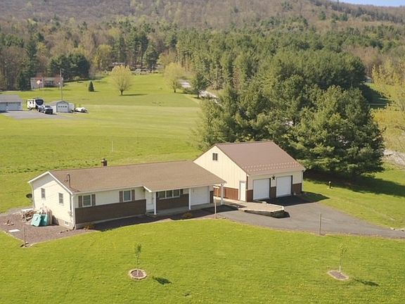 Country roads take you home to this fabulous ranch home on 5+ acres with an absolutely perfect set up for horses, the detached garage/ barn has enough storage for your cars too. An above ground pool in the back yard with concrete patio makes it great for entertaining, and a retaining wall in front with sand for that beach feel. The owner has meticulously cared for this property, adding french drains and rubber mats to the stalls to keep the horses area clean. The immaculate ranch home has a one car attached garage a great eat in kitchen 3 bedrooms and 1 full bath, the basement could be finished for additional living space. The views are incredible and State Game Lands and Sunfish Pond are very close