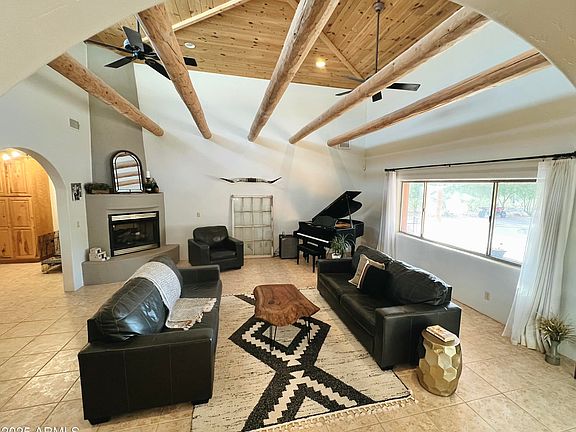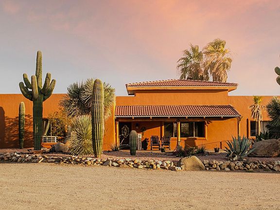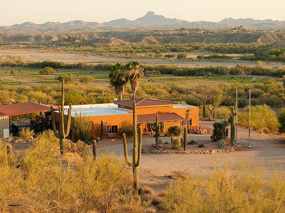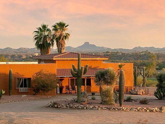 Warmth & Personality greet you at the front door & welcome you into the Grand Living Room w/ Soaring Ceilings adorned w/ massive Round Timber Beams. Expansive arched entry leads into the Heart of the Home. This expansive kitchen space is where you will enjoy everything from your first cup of coffee at dawn to family dinners. GRANITE counters. Marble backsplash. Dual ovens, Kitchen Island w/ Wine Rack. Sliding Glass Patio Doors invite you into a covered, Outdoor Living Space, enclosed w/ tall courtyard walls for comfort & safety for you & your furry family. Impressive views of Vulture Peak. Property offers your guests 2 FULL HOOKUPS for RV's, a 30 & 50 AMP/ another 30AMP-125V at Carport/ & a 50AMP-250V in the 20x42 Shop/RV Garage!
