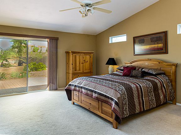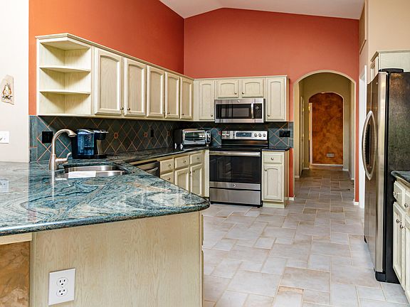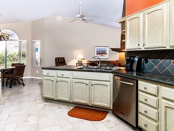 Charming, extended & significantly upgraded Topaz model, sited on an oversized, fully fenced lot! This home has it all, including granite kitchen counters, newer stainless appliances, cozy gas fireplace with attractive tile surround, large office with gorgeous built-in furniture & Murphy Bed, added walk-in closet, remodeled guest and master baths, neutral ceramic tile, newer carpeting, complimentary soft Southwest wall colors & newer exterior paint. Beautiful, mature landscaping with extended brick patio, beehive fireplace, BBQ with prep counter and fruit trees. Extended garage, attic storage, built-in cabinets and workbench area. New garage door installed and driveway re-coated in 2019. Make this beautiful, one owner home yours!