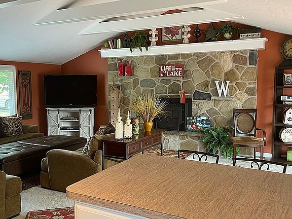 Buyer's agents welcome. 1566 sqft, move in ready, lakefront home on the beautiful 1980 acre all sports Secord Lake. Open living area with snack bar, eye catching cobble stone fireplace in living room with high mantle and cathedral beamed ceiling. Doorwall with side light windows opens to 16' x 16' deck. Spacious kitchen includes pantry closet, refrigerator, stove and microwave. Ceramic tile flooring throughout kitchen and bathrooms. Three large bedrooms with 6' closets. Largest bedroom has doorwall that opens to a 12' x 17' covered porch. Two updated full bathrooms. Laundry room with washer and dryer. Large storage closet and additional utility closet with hot water tank and electrical panel access. Bosch 4 head mini split HVAC system (2019) with electrical baseboard heating assist. Spacious lot with 107' of lake frontage (Lot: 107x199x102x185), paver walkway and stone steps leading to permanent 20' dock with new composite decking, seawall and sandy bottom swimming, 48" firepit, beautiful shade trees, updated landscaping with irrigation system, inground automatic lawn sprinklers. Large 24' x 24' garage with 10' ceiling and loft storage, additional shed for your toy storage. Last but not least...beautiful sunsets.