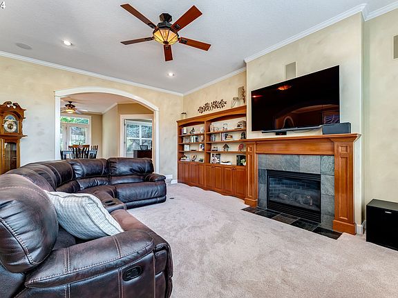 Immaculately maintained home in quiet West Linn neighborhood. Upgrades galore with maple hardwoods throughout main floor, up stairs, and in stairway. High ceilings, crown molding in nearly every room, surround sound. Main floor office with wainscoting and French doors.  Kitchen with gas and stainless appliances, granite, island, and pantry. Formal dining room with arched entryway, built-ins and wainscoting. Dual primary suites, each with attached baths with double sinks, walk-in closets. One with dual faced fireplace, jet tub and travertine tile flooring, shower and counters. 2 private balconies. Incredible yard with updated partially covered deck, water feature, flagstone patio. Incredible storage!  New HVAC including furnace and AC!