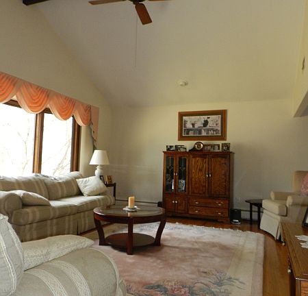 Contemporary home set on over an acre of beautiful, secluded property. Living rm w/ cath ceiling, oversized picture window and h/w flrs, formal dining rm w/ wood beamed ceiling & french doors to deck