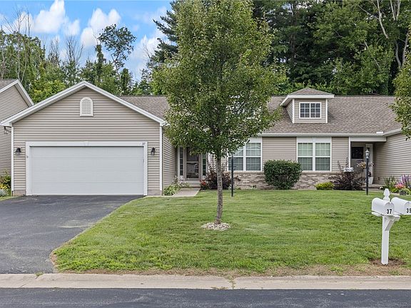 If you're looking for nearly maintenance free living, on a quiet lane with no thru-traffic, in a 55+ community, look no further than 37 Angela Villa! This wonderfully cared for townhome features cathedral ceilings, hardwood floors, gas fireplace, first floor laundry, two full baths, (one is no step, with bench!) an open floor plan, and so much closet space! From the dining area, step outside, through sliding doors, to your private deck, backing to woods. Upgrades include an Eaton whole home generator, 200 amp service, security system, beautiful kitchen cabinetry, and Frigidaire appliances, Maytag washer and dryer, walk in closet off of primary bedroom, and so much more! The spacious basement is just waiting for you to finish, and add additional living space. All of this, and a low HOA! Delayed negotiations 7/26 at 10pm.