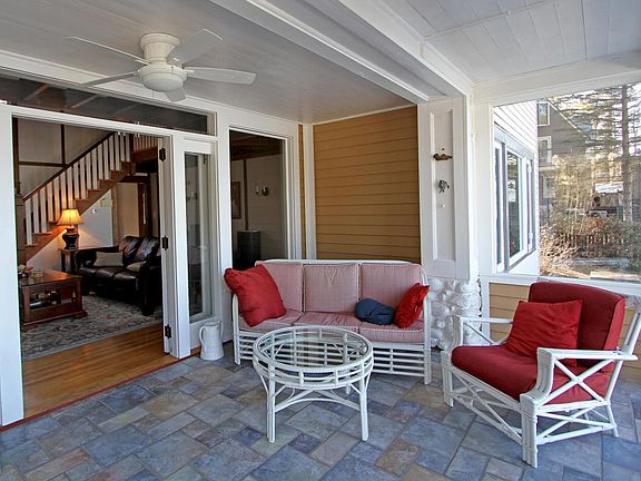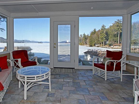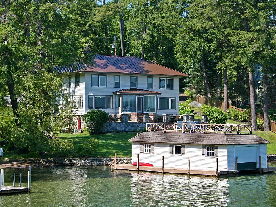 Incredible Views North of lake and mountains. This two story, 4 bedroom home on Lake George has a great room with stone fireplace, VT cast stove, custom cherry kitchen, hardwood floors, air conditioning, and propane heat. Includes a covered deck boathouse w/hydraulic boat lift, and sandy swimming, a terraced lawn & stone patio, 110' of Lake George shoreline.