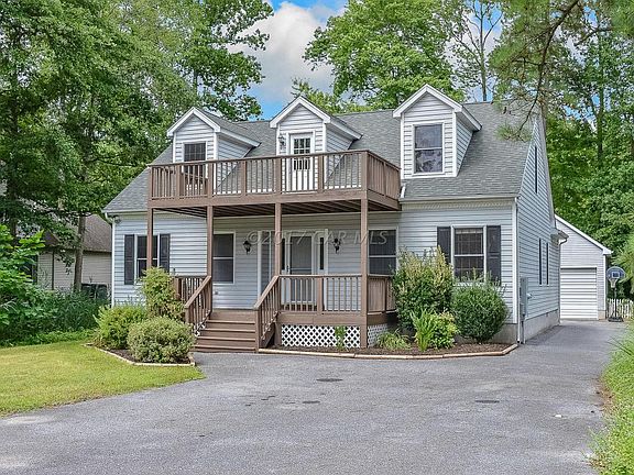 Gorgeous cape cod with views of Manklin Creek from upper and lower decks. Main floor master living with ample room for family/guests. 3 large beds upstairs with full bath, master suite and 5th bed downstairs. 3 zone heat with 2 new heat pumps, fresh paint throughout, new carpeting. 3 season VinylTech(r) enclosed porch/deck. Detached 23x28, 2 car garage with room for storage. Home features hardwood, tile, carpeting throughout.