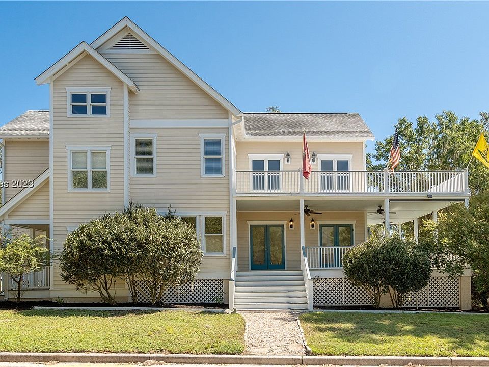 Beautiful Lowcountry home featuring double wrapped porches, vaulted ceilings and updated kitchen. Open living space w/ gas fireplace, built-ins, hardwoods, four sets of French doors, and tons of natural light. Second floor owner's suite leads to another oversized deck with marsh and water views of Battery Creek. Fully fenced in yard with spacious 2 car garage and storage. Community amenities include deep water dock and boat launch, swimming pool, clubhouse, playground and more. Battery Point is close to all shopping and downtown Beaufort.