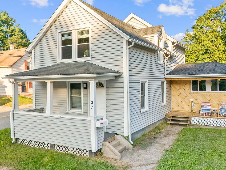 Designed for outdoor living and entertainment, this home features a covered front porch, a side covered porch, a fantastic cabana/fire pit area, and a back deck. Situated on a .21-acre corner lot with a flat, level yard, it also includes an oversized 1.5-car detached garage. Inside, you'll find a stunning kitchen with new custom cabinetry, stainless steel appliances, quartz countertops with a waterfall edge, and open shelving. The kitchen and dining areas are seamlessly combined for a modern, open-concept feel. The spacious living room is just steps away, and the main level also includes a laundry room. The home boasts 2 bedrooms and 2 newly renovated full bathrooms, along with a basement for additional storage. Completely gutted to the framing and rebuilt with a Certificate of Occupancy (CO) in place, it features new insulation, windows, roof, HVAC mini-split system, and hot water tank. All electrical and plumbing systems from the meters inward have been replaced.
