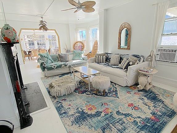 This stately 1890s Victorian is tucked away in the perfect Bellport Village South location, midway between the Great South Bay and the Village center. A lovely approach showcases the property's seclusion with many mature specimen trees. An oversized wrap around porch welcomes you to this 4,500 sq +/-, five bedroom home. Fabulous fluidity exists throughout the home's first level layout. Enter into an inviting, light-filled entry hall with access to a first-floor guest en-suite bedroom. The bright, oversized living room is perfect for hosting guests, featuring an original marble wood-burning fireplace, high-ceilings and wood floors throughout. Adjacent is a dining room surrounded by double hung windows boasting views of the lush backyard. Conveniently situated in the back, overlooking the garden, the eat-in kitchen offers direct access to an expansive wood deck connecting indoor and outdoor spaces for seamless entertaining. A powder room and a Butler's pantry complete this level. The second level is accessed either by the main, sweeping staircase, leading to 4 bedrooms and two full bathrooms or a rear staircase. The third level which leads to a widow's walk is currently enjoyed as a recreation area/playroom and could easily be converted to an office space. Set back from the house is a large pool designed to accommodate short and long-lap swimmers with a wading area for children. Additional features include a partial basement with outdoor access and a 2-car detached garage. This stunning residence is close to all Bellport Village amenities from ferry to Ho-Hum beach, local shops, restaurants and Bellport Country Club.