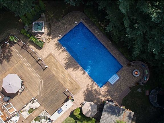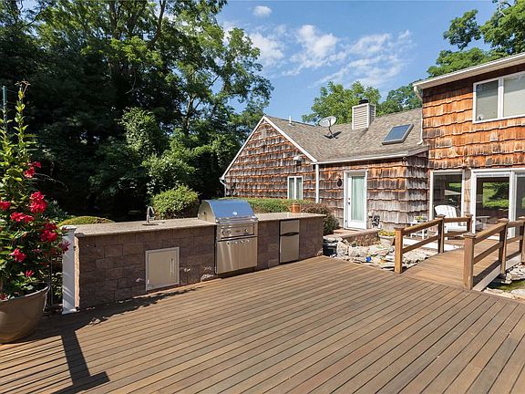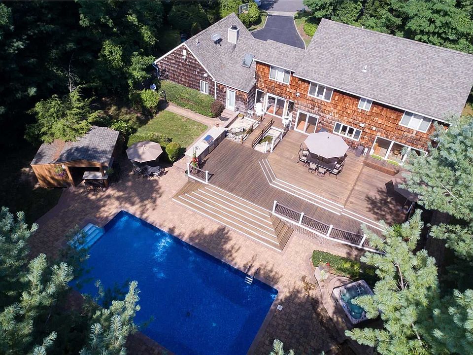 SETAUKET Island Estates--This is a WOW BACKYARD--Mahogany Deck, Salt Water Pool with Paver Patio, Firepit, Hot Tub, Cabana & Outdoor Cooking surrounded by mature plantings create your personal resort! Colonial exterior with lots of windows & open floor plan, renovated kitchen w/granite, SS appliances, coffee station open to family room w/fireplace, full bath w/door to backyard, master bedroom & bath, finished lower level, CAC, 2-car garage, large driveway & IGS on totally private .70 acre lot