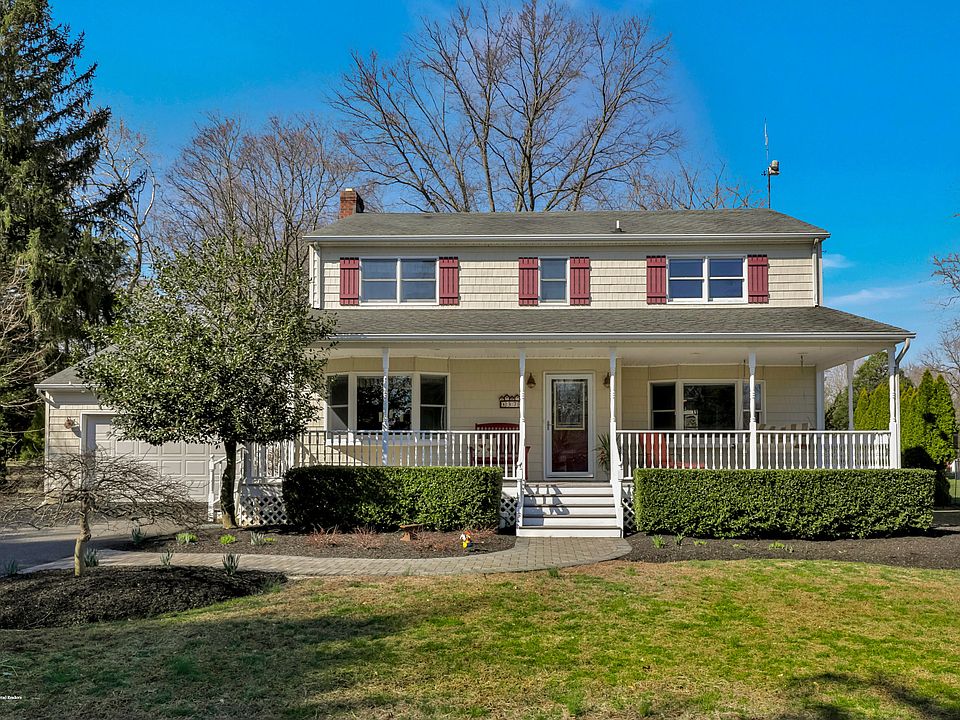 Welcome home! This charming 4 bed, 2.5 bath Colonial with its rocking chair front porch exudes warmth. Features include; hardwood floors (there are hardwood floors under all the carpets except small portion near fireplace), decorative molding, recessed lighting, inviting, sun-filled Family Room with bow window. The heart of the home is the kitchen with large center island and slider door to deck. Dining room has lovely views of the deep backyard and mature landscaping. Spacious Master Bedroom has a full bath. Enjoy outdoor entertaining under the pergola while sitting by the fire pit. Very large deck is complete with outdoor bar over-looking in-ground heated pool & lush greenery. Home offers a 3 car garage, generator, workshop in basement & shed.