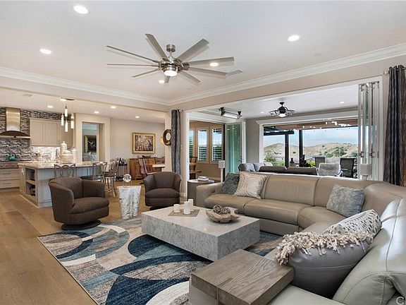 BELLS, WHISTLES, AND AN EXTRAORDINARY VIEW⦠OH WOW⦠Enjoy panoramic views of rolling hills, open space & a short walk to The Hill Top Club. This popular single-story, open-concept, Cortesa Plan 3 was built by Shea Homes. The plan provides 2 ensuite bedrooms, and optional 3rd bedroom (currently used as an office). The gourmet kitchen opens to a formal dining area, and great room perfect for a gathering. Within the home there has not been one detail left out. A short list of upgrades include: Crown Molding throughout, Plantation Shutters, bi-fold doors to create indoor/outdoor living, engineered wood flooring, 4â baseboards, multiple built-ins, custom lighting, Quartz counters in kitchen and baths, upgraded appliances, custom closets, Solar system, and is Electric Vehicle Ready. Though the floorplan of the home is enticing, it is the outdoor entertainment area that will captivate you. The California Room has a stacked stone fireplace, wood tile flooring, two separate patio areas that can be enclosed with remote-operated screen dividers, two separate designer water fountains, built-in BBQ island, Aluminum Pergola, and all landscaping is on timed drip system with no maintenance turf. No expense spared on the limitless upgrades this home offers. From Venetian plaster surfaces to the tech savvy updates, your senses will be heightened at every turn. Amenities include 3 gyms, numerous clubhouses, pools, exercise classes, hiking and biking trails and a social scene like no other.