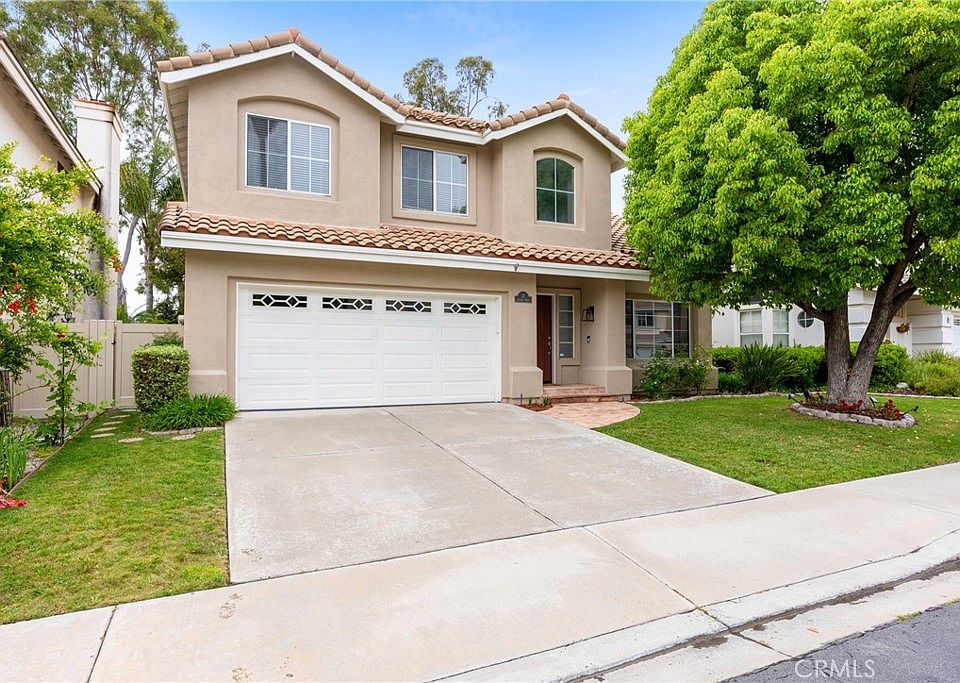Beautiful move in condition, contemporary remodel in Pacific Hills! Excellent 4-bedroom floorplan with spacious rooms and open concept. Enter into a light bright interior with soaring ceilings to formal living/ dining. Step through to the great room with spacious kitchen opening to dining and family rooms! Upstairs enjoy the luxurious primary suite with barn door leading to an updated master bath with two spacious closets and separate tub/shower – looking out to treetop views! Many recent upgrades including: luxury vinyl flooring with upgraded baseboards, fresh interior and exterior paint, quartz countertops and tile backsplash in kitchen, refreshed cabinetry with new hardware, newer dishwasher, new sink and faucet, recessed lighting in kitchen and many light fixture upgrades both inside and out, upgraded/replaced switches and outlets including addition of USB ports, interior doors, trim and hardware, updated fireplace; smart thermometer, ring doorbell, keyless entry, 240 volt charging station in garage, and more! Backyard includes plenty of patio area, grassy yard, and a fabulous lime tree! No homes behind adds privacy. Peek-a-boo views from downstairs, with additional views from upstairs master (is improved when HOA trims trees on greenbelt behind home.) Home includes Lake Mission Viejo membership with beaches, boating, summer concert series and so much more. Home is walking distance to Newhart Middle School, soccer fields, shopping centers, walking trails and community center! Come make this great property- home!