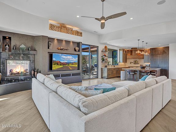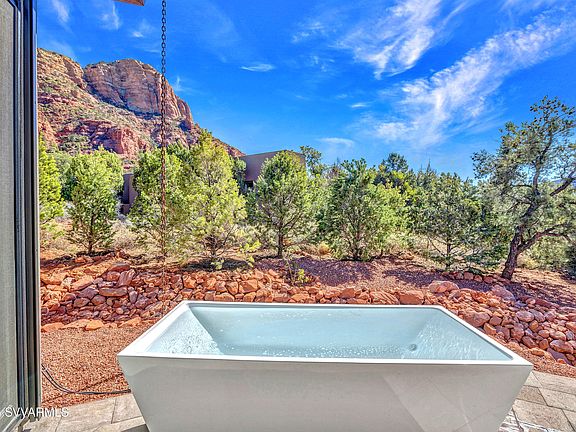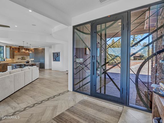 Experience Sedona's striking red rock vistas in this 2021 modern minimalist, single-level retreat with owned solar. Every detail is refined for style and sustainability. Enjoy panoramic views of Cathedral Rock, Elephant, and Jerome's glittering lights. The open great room and split floorplan merge seamlessly with a chef's kitchen featuring a 10 ft granite island, quartz counters, and high end Thermador appliances including a 6 burner gas range, double ovens, pot filler, and innovative fridge design. The primary suite is a serene haven w/ a spa bath showcasing Kohler sinks, radiant floors, a Bain Ultra Air Tub, Toto fixtures, and a private utility nook. Outside, a fully fenced patio with an outdoor kitchen, BBQ, firepit, and sky deck invites stargazing & true relaxation in nature's embrace Notables of home: All Anderson windows and Doors. Leathered granite counters in all bathrooms and counters in closets and outdoor kitchen countertop. Built out organized closets in every bedroom ( including stainless valet rods at primary walk in closet). 220 Outlet Available for an EV Charging Station in OVERSIZED 650 sq ft 2.5 car garage with 8 foot doors. This SMART Home has surround sound/ cameras/ phone system and water monitoring for the discerning Buyer. 2 RUUD HVAC units for 2 zones. Pay attention to the curves in great room at 10 ft, 11 ft and 12 ft for a more dramatic ceiling design coupled with the curvature of the butted windows at the dining room and curved sky deck and curved metal railing.