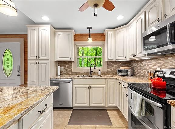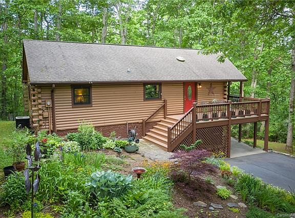 Wooded wonderland! This updated log home is warm and welcoming and offers so much. Main level is open and bright with vaulted ceilings and a rustic stacked-stone fireplace with gas logs. The kitchen has been completely remodeled with stainless appliances, granite counter tops and a tile back splash. Two bedrooms on main level and bed/bonus/office on lower level with family room with a cozy wood stove that opens to a private patio. Large, private yard with good mix of sun and shade - a gardener's paradise, with raised beds in place! Outbuilding and spacious carport for storage. Located in a quiet South Buncombe neighborhood, close to shopping, dining and more, and an easy commute to Downtown Asheville or Downtown Hendersonville.
