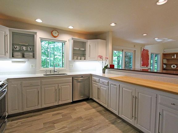 This extraordinary contemporary is a sanctuary in the woods and comes with extensive frontage on the Mill River yet is close to everything! The open, flowing floorplan features hardwood floors, skylights, and cathedral ceilings. The kitchen has quartz countertops, stainless appliances, and opens to dramatic dining area and living room with floor-to-ceiling windows, fireplace, and sliding glass doors to large deck overlooking the river. First floor also has media or family room with half bath, plus a handy mudroom with adjacent laundry. The upstairs master suite features a gracious bedroom and full bath with an additional suite with full bath on the 3rd level. Also on the 2nd level are 2 bedrooms and bath. Tucked privately above the garage is a 4th spacious bedroom and bath with many use options and the finished lower level offers even more space!