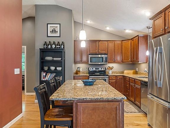 - Kit Dscrp: Window(s) - Picture, Main Level, Flooring - Hardwood, Countertops - Stone/Granite/Solid, Ceiling - Cathedral, Breakfast Bar / Nook, Kitchen Island, Stainless Steel Appliances, Open Floor Plan, Recessed Lighting, Lighting - Pendant