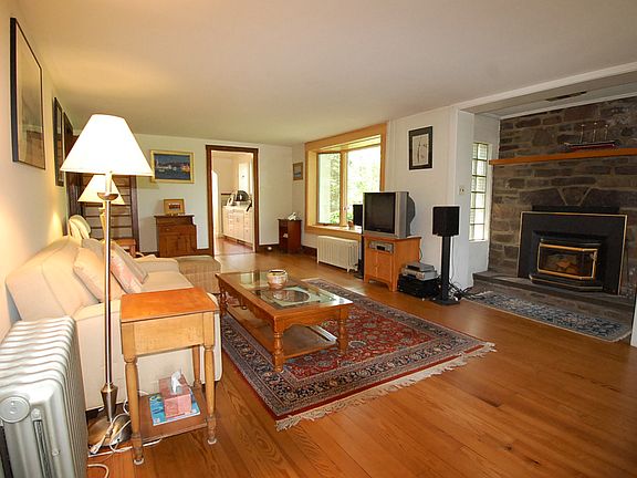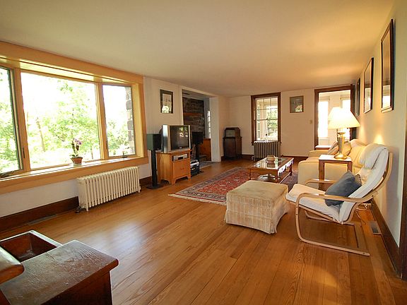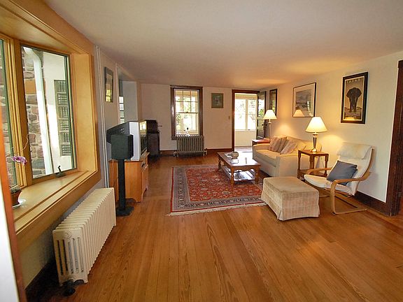 Vintage stucco and stone Cape on large corner lot, located at the top of Lambert's Hill just above downtown Lambertville. Lots of natural light. Polished hardwood floors. Stone fireplace in living room with wood-burning insert provides efficient additional heating and no-fuss fireside chats. Large bay window in living room overlooks lush landscaping with mature trees, blooming shrubs and perennials. Enclosed front porch is all windows and is heated for year-round enjoyment. Dining room off kitchen has hardwood flooring and overlooks the yard. Two bedrooms and full bath are also on the first floor. Master suite is privately situated on the second floor and includes a spacious full master bath. Full basement with room for hobbies, laundry, storage. Detached 2-car garage including a large workshop in rear overlooking the backyard woodworkers / artisans, this is for you! Also gives you plenty of room for storing your fun stuff like kayaks, bikes, motorcycles and inner tubes. (For tubing on the Delaware River, of course!) A variety of outdoor spaces offers opportunities for entertaining, gardening or simply relaxing in soothing natural surroundings. The almost half-acre level yard allows for lots of play space and plenty of room for a large vegetable garden, too. Walk to Lambertville for the bus to NYC or PA. Enjoy all the benefits of Lambertville living fine dining, shopping, outdoor recreation of all types along the scenic Delaware River with more elbow room! One-year American Home Shield home warranty included.