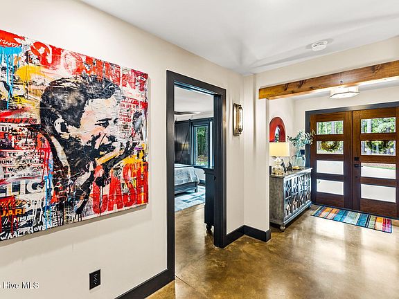 Stunning 2,503sqft. Tab Premium Built Home nestled on a serene 3.83-acre lot in Gables Run Community! This uniquely designed property offers a harmonious blend of comfort and style. Floor plan was purposely designed with two bedrooms and 2 baths, but with the easy use of a 3rd. If you prefer, utilize the large multi-functional room as the 3rd Bedroom! Which also has other endless possibilities like a man cave, gym, or game room. This home is a dream come true for entertaining! Step inside to find a one-story layout that ensures effortless living with no stairs to navigate. A chef's paradise awaits in the gourmet kitchen, featuring two ovens, a gas range, and a generous 11-foot island with a 30-inch deep workspace, adorned with leathered granite countertops and custom hood range. The rich walnut waterfall bar and two custom cedar beams enhance the kitchen's elegance while offering an abundance of storage and prep space for your culinary creations. Enjoy the ease of stained concrete floors throughout, making maintenance a breeze. The master suite provides a private retreat, boasting a luxurious walk-in shower that seamlessly connects to a spacious closet and conveniently leads to the laundry room. Thoughtful touches include custom built-in dog kennels in the back foyer, with fenced in area outside also ready for your beloved pets to stay. Step outside to experience an exceptional outdoor living area featuring a screened-in porch complete with a gas fireplace, a lovely patio, and a large 7 person hot tub, creating the perfect escape for gatherings or quiet evenings.
