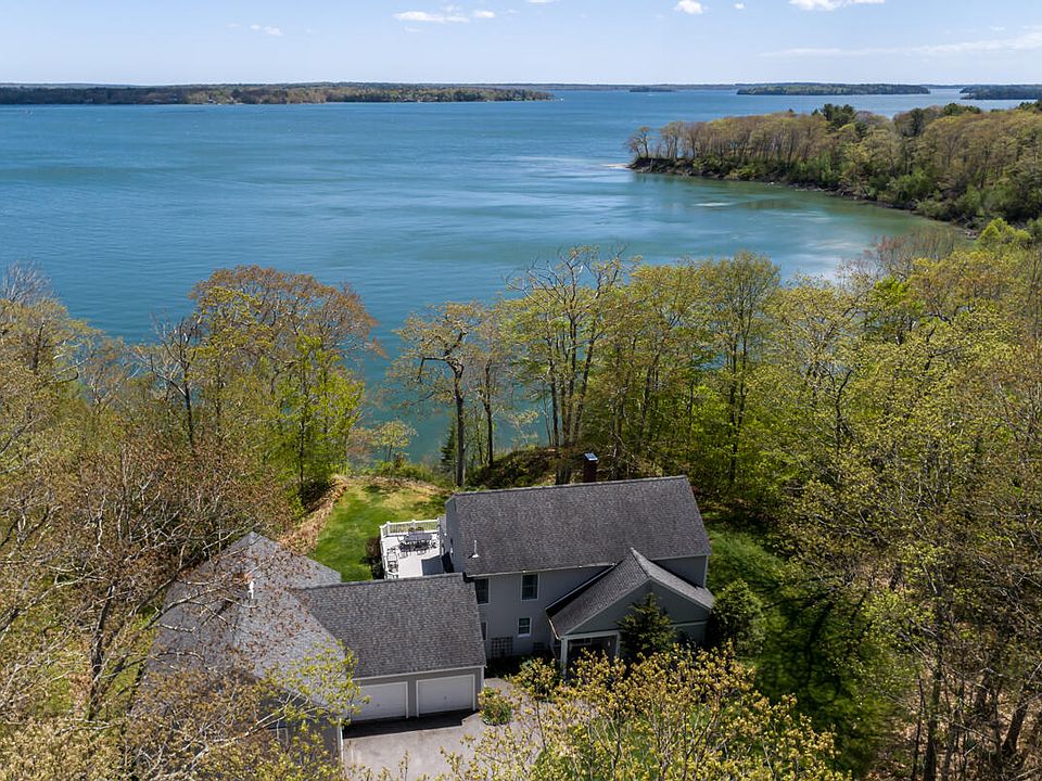 Spectacular Maquoit Bay waterfront home with sweeping ocean views set on 5 acres with private pond. Enjoy morning sunrises while drinking your coffee on the waterfront deck. This home offers amazing water views from all 3 floors including 5 bedrooms, 3.5 baths and 241 ft of owned water frontage. The inside living space offers lots of large windows, allowing natural light to radiate through the open concept first floor plan. Enjoy the wood stove on those cold winter nights while reading a book in the den. The primary suite is tucked away from all the other rooms on the first floor. The second floor offers 4 additional bedrooms and 1 full bath. Lower level is mostly finished with a full bath and slider out to a patio deck. There is a walking trail and stairs that meander down to the shore. This truly unique property also offers an attached 36' X 28', 2-story barn along with the attached 2 car garage. This property has a strong rental history on VRBO--with gross rental income of $86,498 in 2020 and $72,724 in 2021. This home has Smart Home technology, allowing you to monitor and change settings remotely. Rentals booked thru August; closing date and terms of remaining rentals are negotiable. This home is being sold fully furnished with exception of some items--see exclusion list. Dock and float or mooring ball are all possible with proper permitting. Located just ten minutes to downtown Freeport and Brunswick you can enjoy shopping and dining without a long commute. Wolfe's Neck State Park is right around the corner and Portland Jetport is just a 30-minute drive. Don't miss your chance to own a prime waterfront property in Freeport, Maine! Lot may be sub-dividable with town approval. Home has a 4-bedroom septic system but town recently issued a Certificate of Occupancy for a 5-bedroom home in 2021.