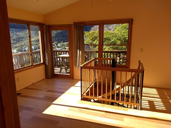 This OLD BISBEE mountain top, remodeled in 2018, custom built home w/spectacular views has 2000+sq.ft. living space on the interior plus 1000 sq.ft. wrap around deck offering total SERENITY along w/plenty of parking below. Native fir and engineered wood flooring throughout home; forced air heating and minisplit for cooling ;cedar exterior siding; oversized windows. Master suite w/bath upstairs, via spiral staircase. BLM land surrounds side & rear. Added kitchenette makes this property useful for renting out part of the home or mother in law unit. Downstairs unit would be a 2 bedroom 1 bath, all on ground level; Second unit would be two levels with great room/kitchenette & half bath downstairs, spiral staircase to upper level master bedroom suite w/full bath. Property oversees entire town of Old Bisbee. Truly a one of a kind. Priced well at $142 per square foot. Also available 3 adjacent building lots for $65,000.