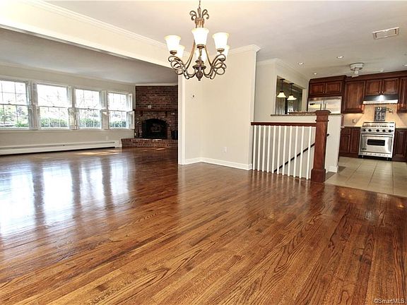Conveniently located off the post road, this ranch style home offers a wide open floor plan. The large living room has a beautiful floor to ceiling brick fireplace at the center with lots of windows making it very bright; the updated kitchen offers stainless appliances including gas stove, granite counter tops and tile floor; large dining room; hardwood floors and crown molding through-out. The main floor includes master bedroom with full bath and 2 additional bedrooms, all hardwood floors. The lower level offers a large family room with fireplace and a den which can be converted into a 4th bedroom. Additional features include deck off of the living room, patio below and a large level lot. Great for families and pets. Centrally located walking distance to schools, train & shopping.