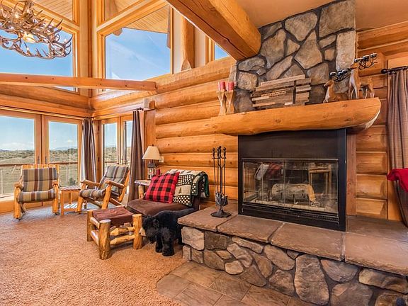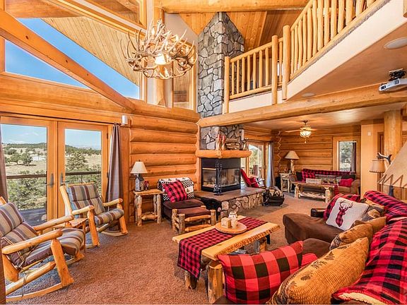 When people daydream of living in Colorado, this is the house they see! 2600 square feet of living space in this custom log home tucked up in the foothills. Luxury features include 2 fireplaces, tandem Rinnai tank-less water heaters and a home theater system including surround sound, projector and cleverly hidden drop down screen. The 8 person hot tub sits on the Trex wrap around deck. Take a soak and watch the sun set! The home is constructed of Douglas Fir logs brought down from British Columbia and has top end Anderson windows and doors throughout. The front of the house has vaulted ceilings with huge windows and an amazing view. Main level has cozy living room with 3 way wood burning fireplace, full bathroom, laundry room, dining area and open kitchen with granite counters with all appliances. Walkout basement has large master bedroom with walk in closet, corner gas log fireplace and attached Vegas-style 4 piece bath with dual sinks and walk in shower. The bathroom opens up to hallway across from the 2nd bedroom. Upper level loft has two sleeping areas, 2 closets and their own sitting areas. Check out the little reading nook up the ladder! All of this sits on top of 20 acres of peace and quiet. Ready to be your full time home or your perfect mountain vacation retreat. Come fall in love today!!