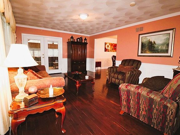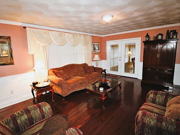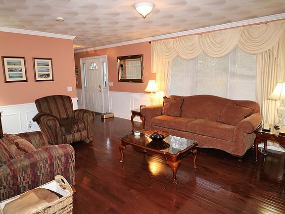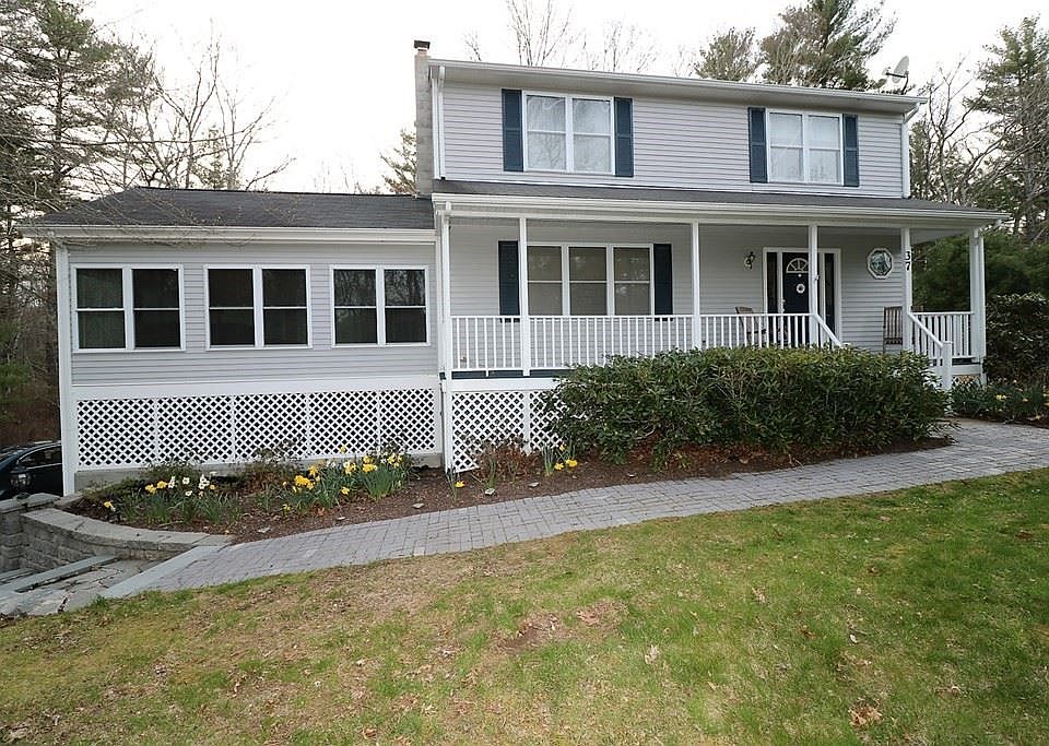 A 3 bedroom, 2.5 bath Colonial with a beautiful Farmers Porch, an oversized two-car garage, on two acres of land! Stunning hardwoods, Wainscotting, and Crown moldings adorn the entry and huge living room! The dining room has chair rails, Crown moldings, and hardwoods and the Eat-in kitchen has granite-capped counters, stainless steel appliances, wood cabinetry. A heated/air-conditioned, enclosed deck is just off the kitchen and a cute half bath is nearby. A. "Spectacular" family room, also on the first level, awaits you with towering ceilings, hardwoods are gorgeous and you're wrapped by incredibly large area windows. The wood-fired stove adds a welcoming ambiance. Upstairs are three generous-sized bedrooms in total with the Master bedroom enjoying a walk-in closet and private bath. The main bathroom has double vanities, a tub/shower combo, lots of cupboards, and a linen closet. Enjoy a large caterers kitchen in the basement for your party prep work and there's storage galore!
